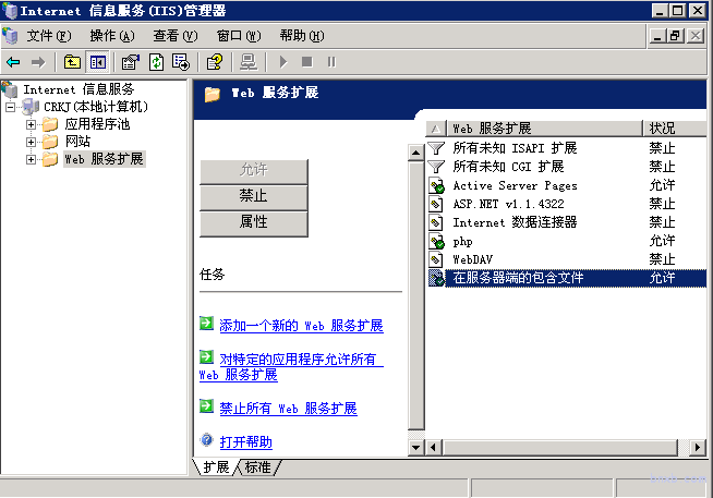 修改IIS设置,将在服务器端的包含文件修改为允许