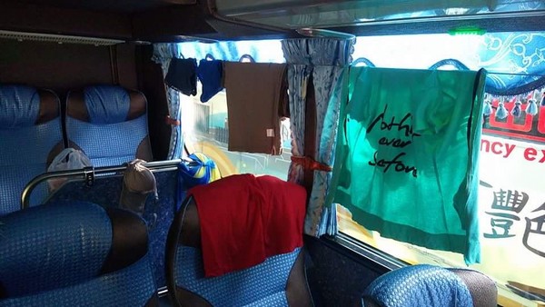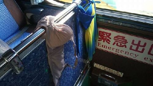 原来是大陆游客把洗好还没干的衣物,直接在游览车裡晾晒起来,上衣、裤子挂在车窗旁,内裤挂在座位后把手上,胸罩、比基尼更挂在座位前的挡板。他们还自备晒衣绳夹,俨然把整个游览车当成自己的晒衣场,一串内裤就这样晾在走道上。