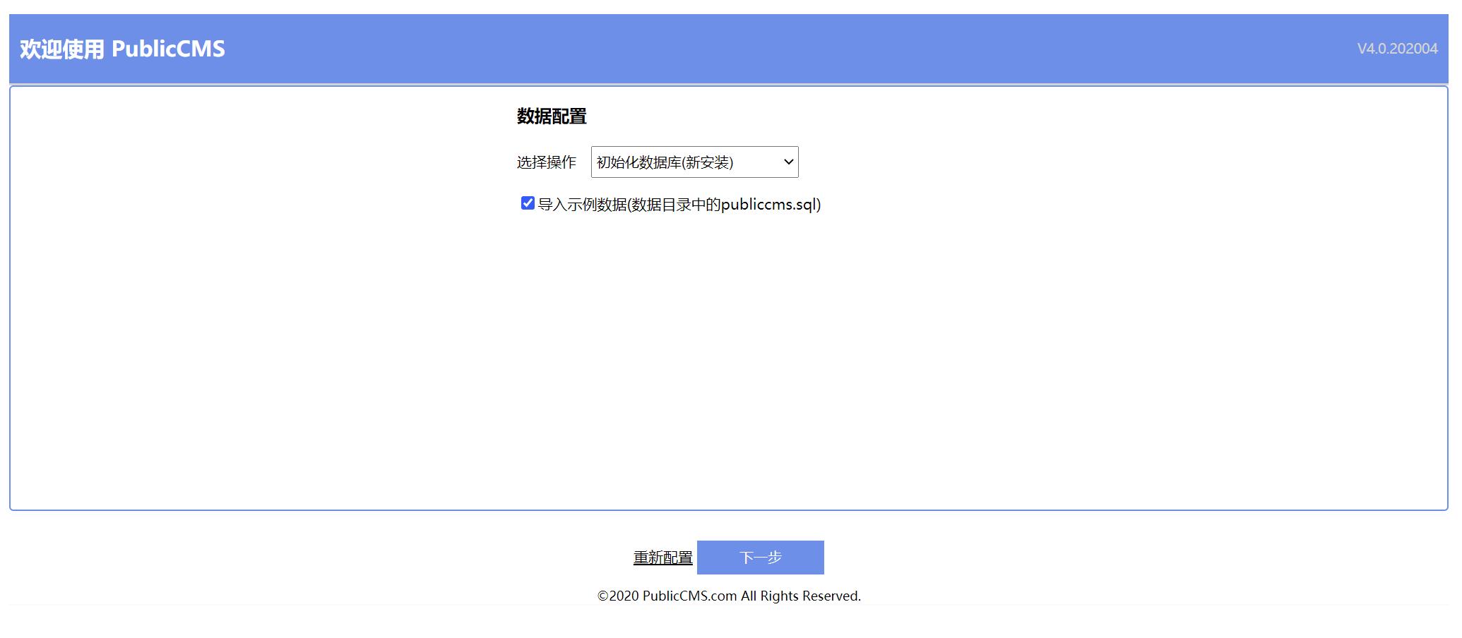 初次安装可以导入示例数据(数据目录中的publiccms.sql)以便熟悉系统,将数据目录指向空的目录,将不会显示导入示例数据选项。