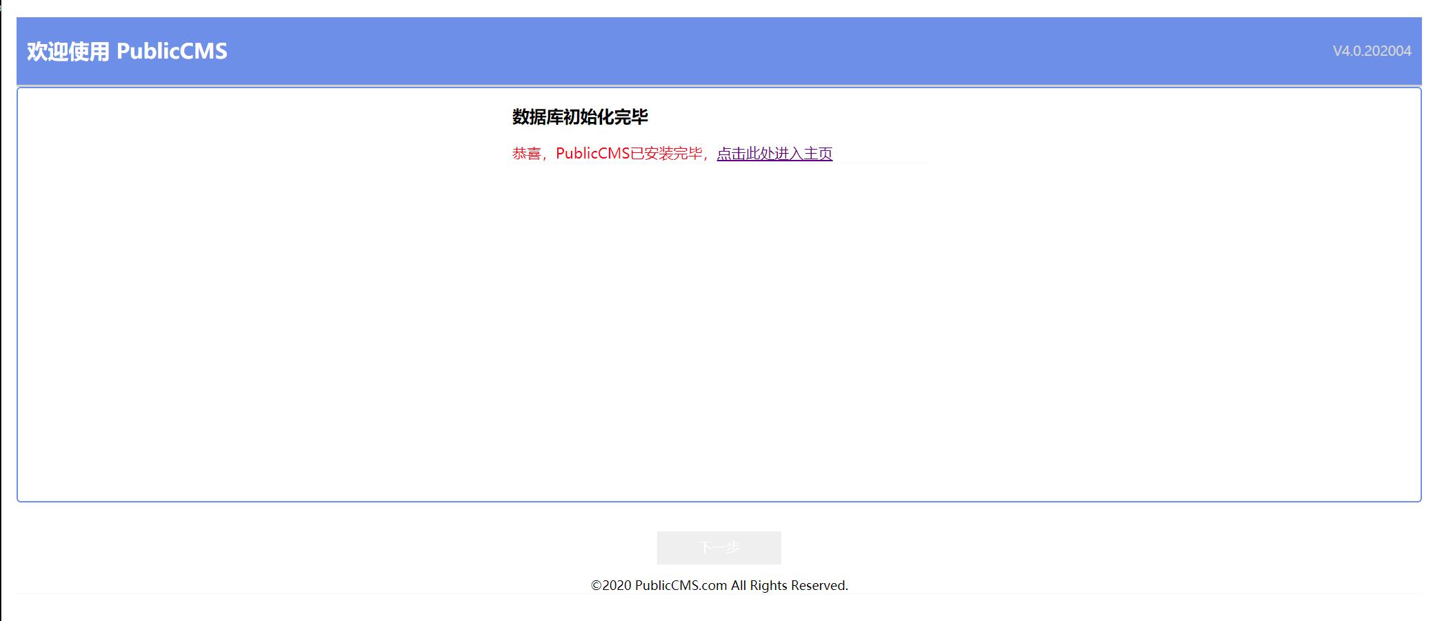 一般访问地址为http://localhost:8080/(2022年以前的版本为http://localhost:8080/publiccms/),会自动跳转到安装页面