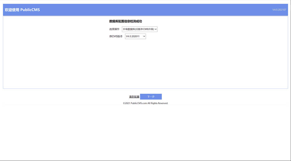 CMS已经默认了升级数据库的操作,并选中了原CMS版本。请确保已经备份过数据库,然后点击下一步开始升级。也可以点击重新配置,重新配置数据库连接,或者原CMS版本进行升级,或选择其他操作。