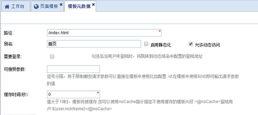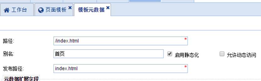 普通页面模板静态化时需要在后台模板元数据中设置为启用静态化,并将发布路径配置为实际需要的访问路径。