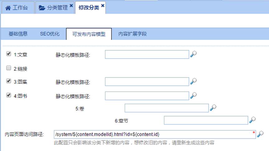 并在分类勾选对应模型,将静态化模板清空,设置内容页面访问路径为上面的模板路径,参数名为上面的可接受参数名,值为${content.id}