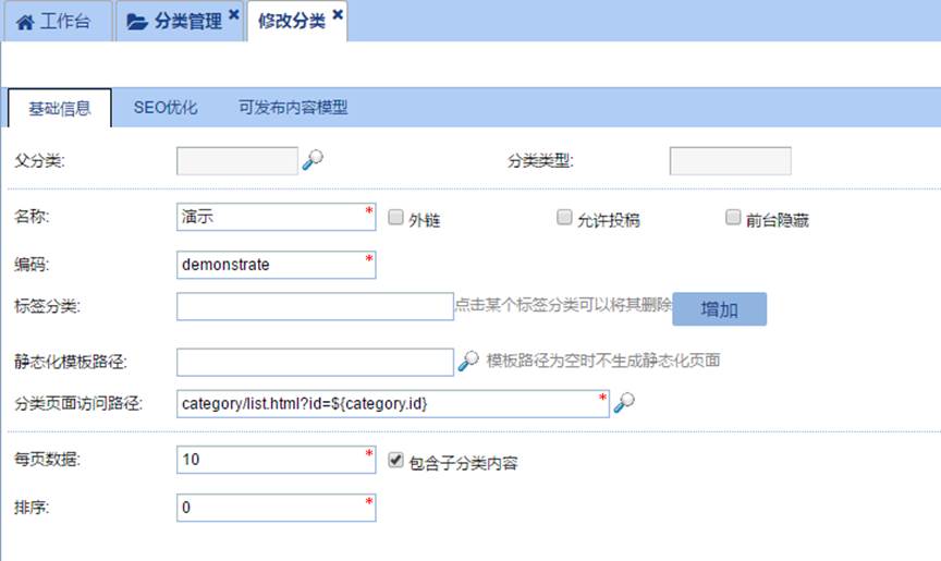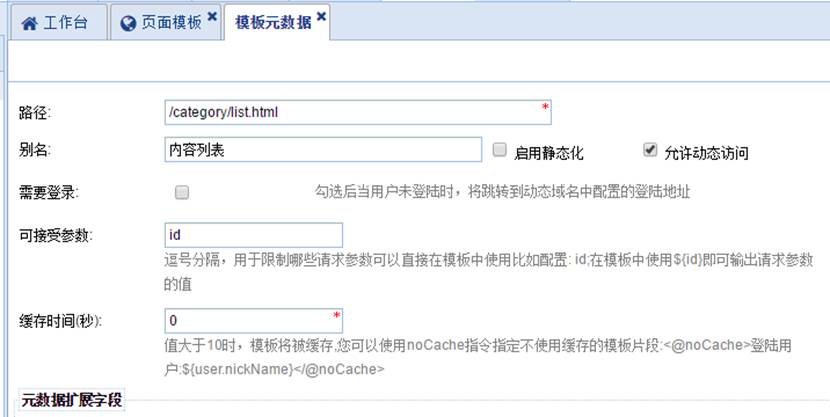 并在分类设置中将静态化模板清空,设置分类页面访问路径为上面的模板路径,参数名为上面的可接受参数名,值为${category.id}
