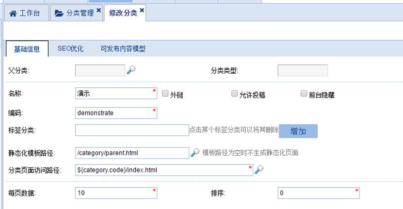 分类页面模板静态化时需要在后台分类管理为分类设置静态化模板,并配置分类页面访问路径。在分类保存时,批量生成分类首页时,生成分类页面时,任务计划生成时就会使用配置的模板为分类生成静态化页面。